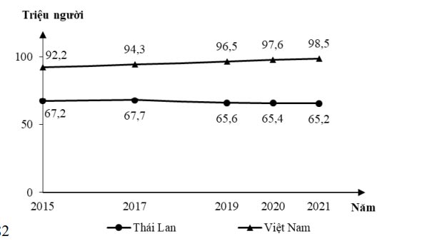 Theo biểu đồ, nhận xét đúng về thay đổi số dân năm 2021 so với năm 2015 của Thái Lan và Việt Nam là Thái Lan giảm và Việt Nam tăng |