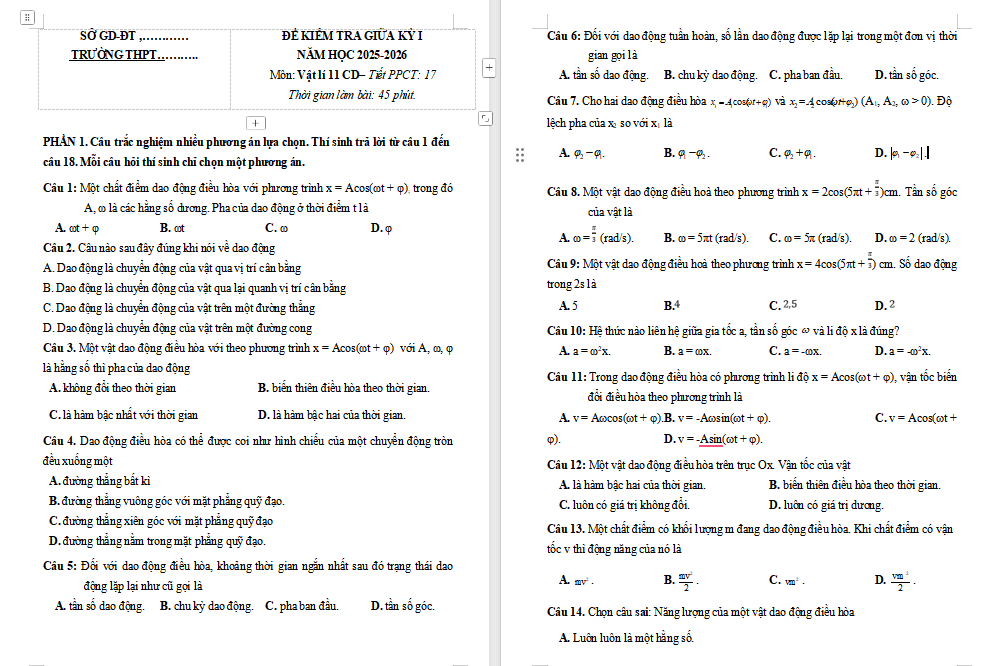 Bộ đề thi giữa kì 1 Vật lý 11 có cấu trúc như sau: