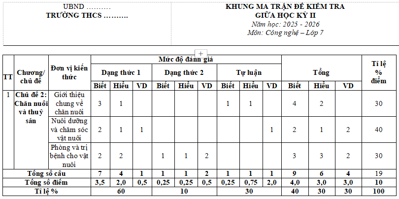 Lưu ý: Đề kiểm tra giữa kì 2 Công nghệ 7 Cánh diều năm 2026 có cấu trúc như sau. Tùy theo yêu cầu của từng Sở mà quý thầy cô ra đề kiểm tra phù hợp với địa phương mình