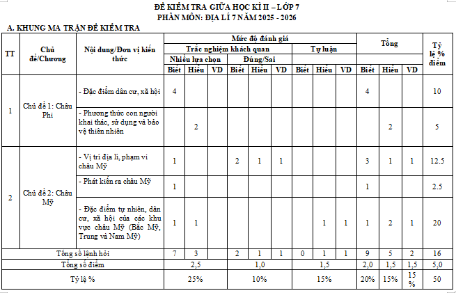 Lưu ý: Bộ đề thi giữa học kì 2 Địa lí 7 Kết nối tri thức có cấu trúc như sau. Tùy theo yêu cầu của từng trường mà thầy cô ra đề cho các em nhé.