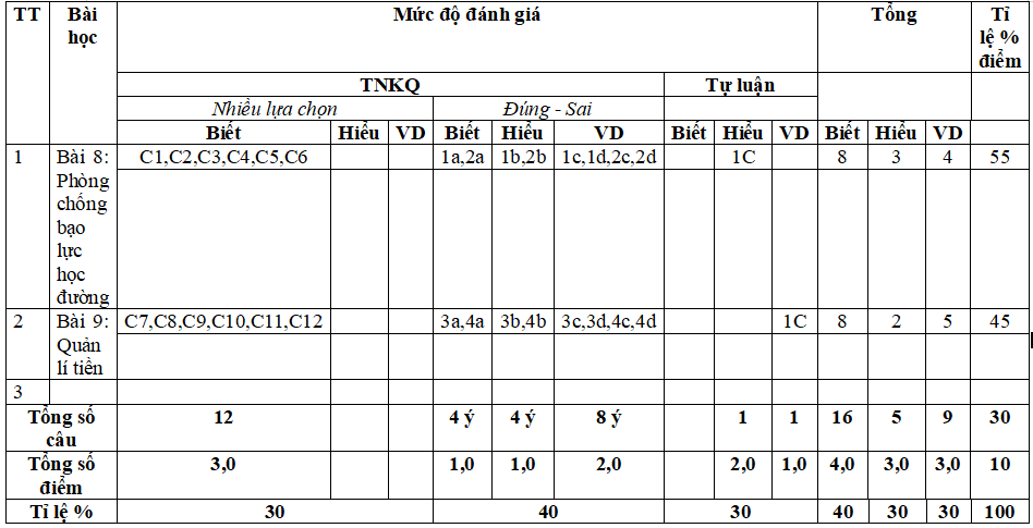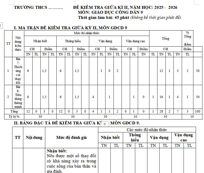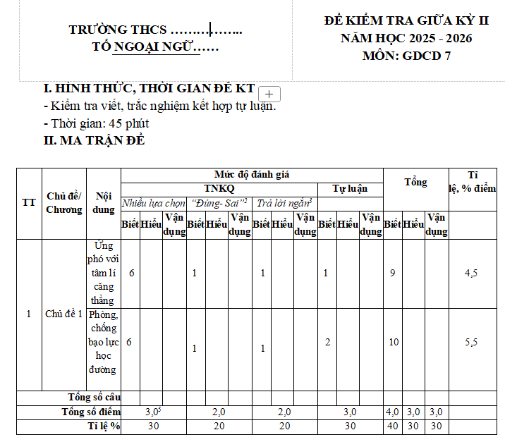Lưu ý: Bộ đề thi giữa học kì 2 GDCD 6, 7, 8, 9 Chân trời sáng tạo có cấu trúc như sau. Tùy theo yêu cầu của từng trường mà thầy cô ra đề cho các em nhé.