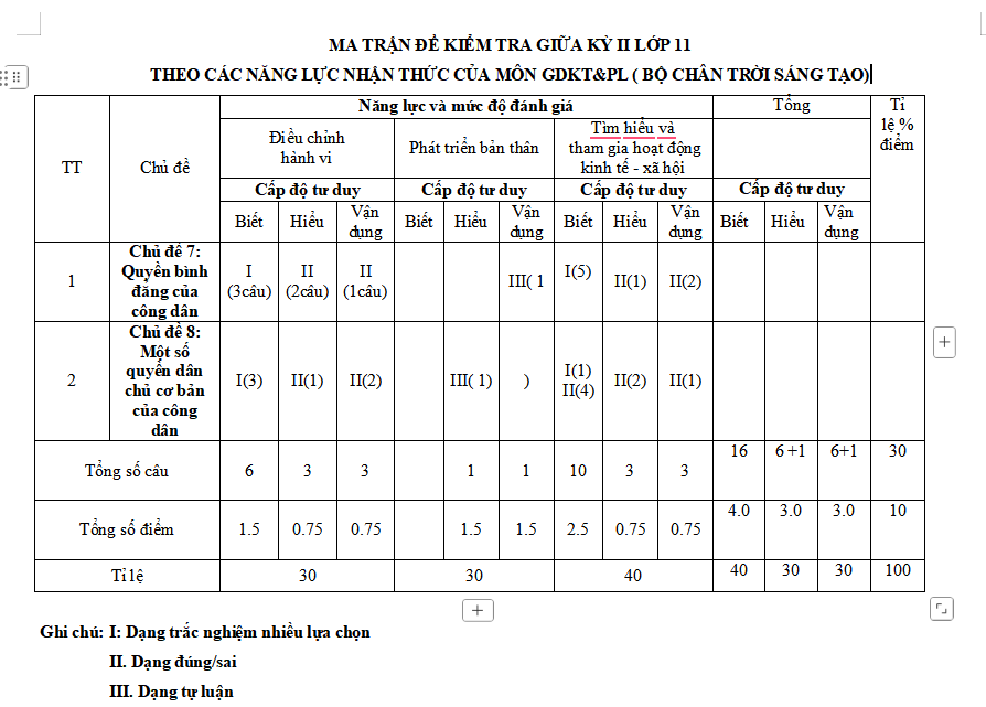 Lưu ý: Bộ đề kiểm tra giữa kì 2 Giáo dục kinh tế Pháp luật 11 Chân trời sáng tạo có cấu trúc như sau. Tùy theo yêu cầu của từng Sở mà quý thầy cô ra đề kiểm tra phù hợp với địa phương mình