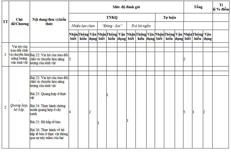(Chú thích các kí hiệu trong khung ma trận và bản đặc tả: PA là trắc nghiệm nhiều phương án lựa chọn (4 phương án chọn 1 đáp án đúng); ĐS là trắc nghiệm lựa chọn đúng, sai; TLN là trắc nghiệm trả lời ngắn)