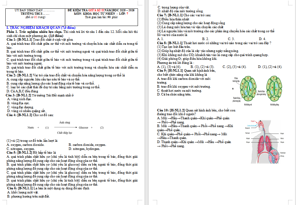 BÀI KIỂM TRA GIỮA HỌC KÌ II NĂM HỌC 2025 - 2026 Môn Khoa học tự nhiên lớp 7 Thời gian làm bài: 60 phút, không kể thời gian phát đề |