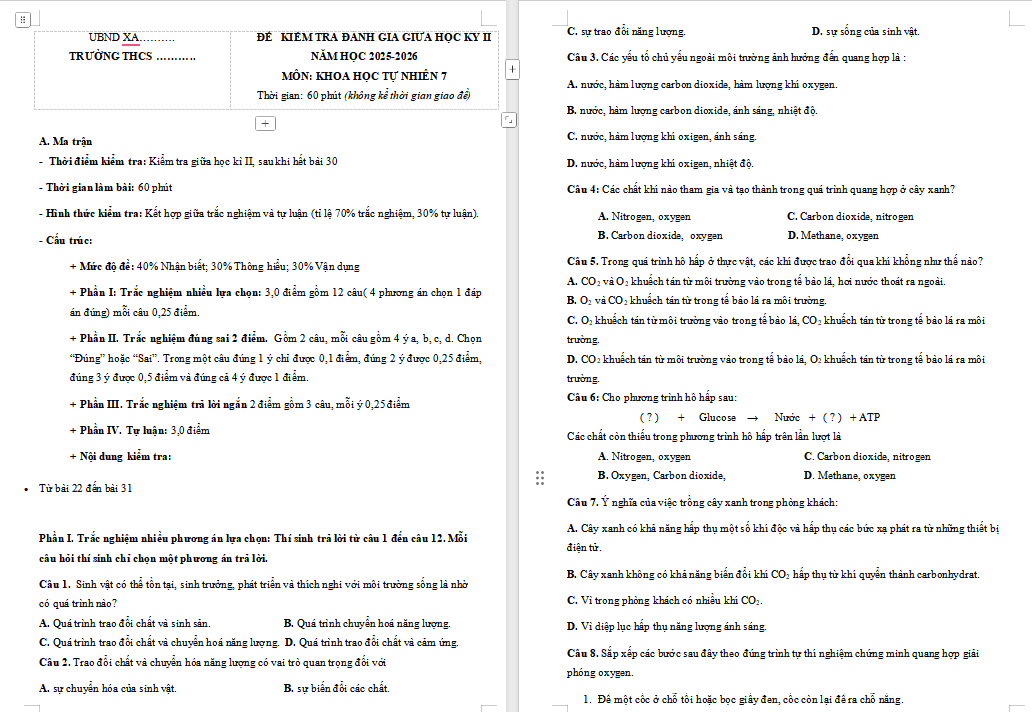 A. MA TRẬN, BẢN ĐẶC TẢ VÀ ĐỀ KIỂM TRA GIỮA KÌ 2, KHOA HỌC TỰ NHIÊN 7 NĂM 2025 - 2026