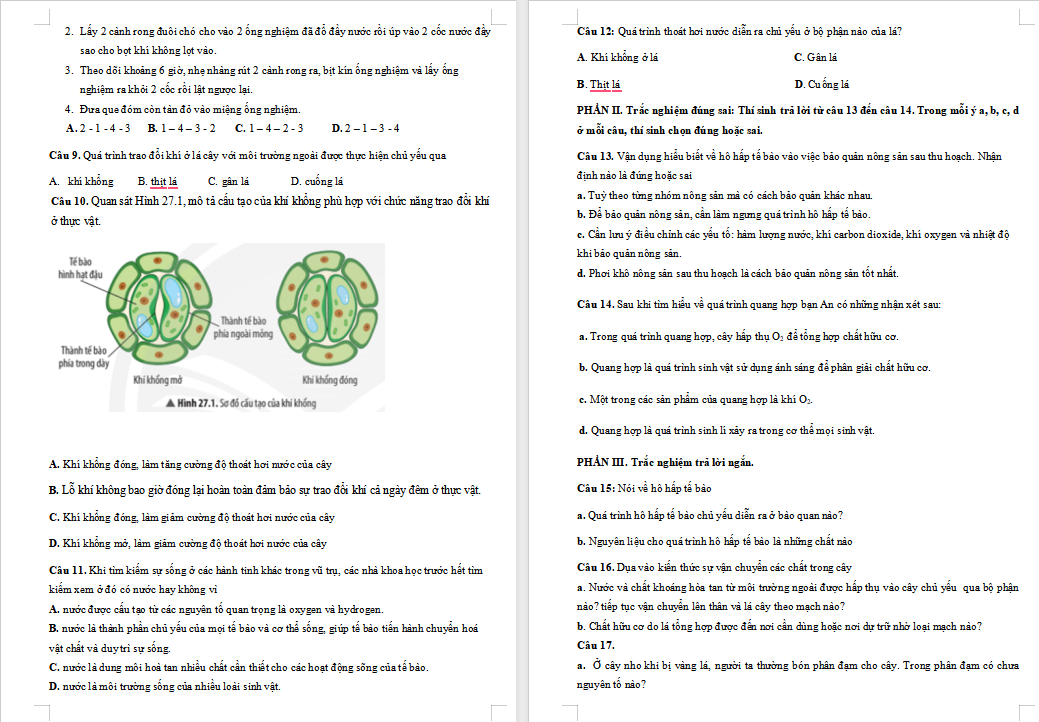 Câu 15. (0,5đ) Hãy xác định các phát biểu sau là đúng hay sai đối khi nói về thân vận chuyển nước và lá thoát hơi nước ở thực vật.
