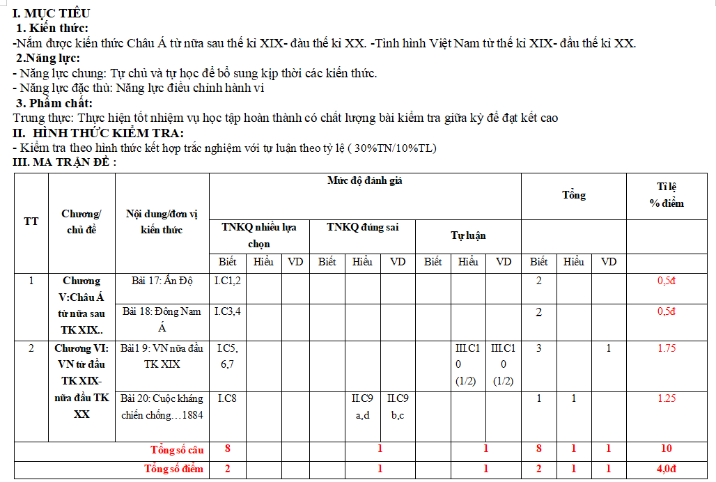 Lưu ý: Bộ đề thi giữa học kì 2 Lịch sử 8 Chân trời sáng tạo có cấu trúc như sau. Tùy theo yêu cầu của từng trường mà thầy cô ra đề cho các em nhé.