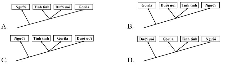 Sơ đồ cây phát sinh chủng loại nào sau đây phản ánh đúng quan hệ nguồn gốc giữa các loài nói trên?