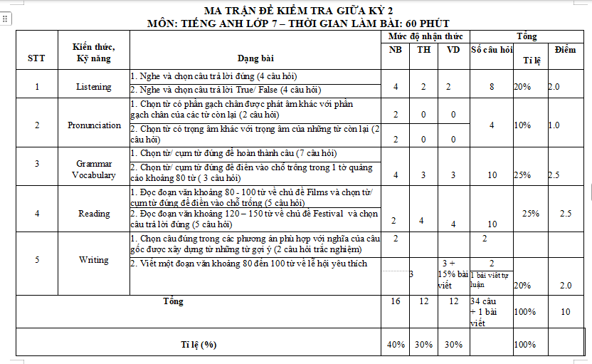 Lưu ý: Bộ đề kiểm tra giữa kì 2 Tiếng Anh 7 Kết nối tri thức có cấu trúc như sau. Tùy theo yêu cầu của từng Sở mà quý thầy cô ra đề kiểm tra phù hợp với địa phương mình