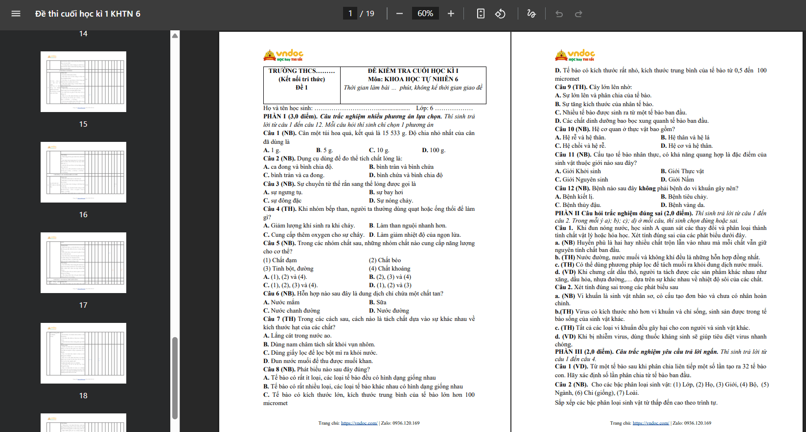 Tên tài liệu: Bộ đề thi học kì 1 lớp 6 môn KHTN theo Công văn 7991