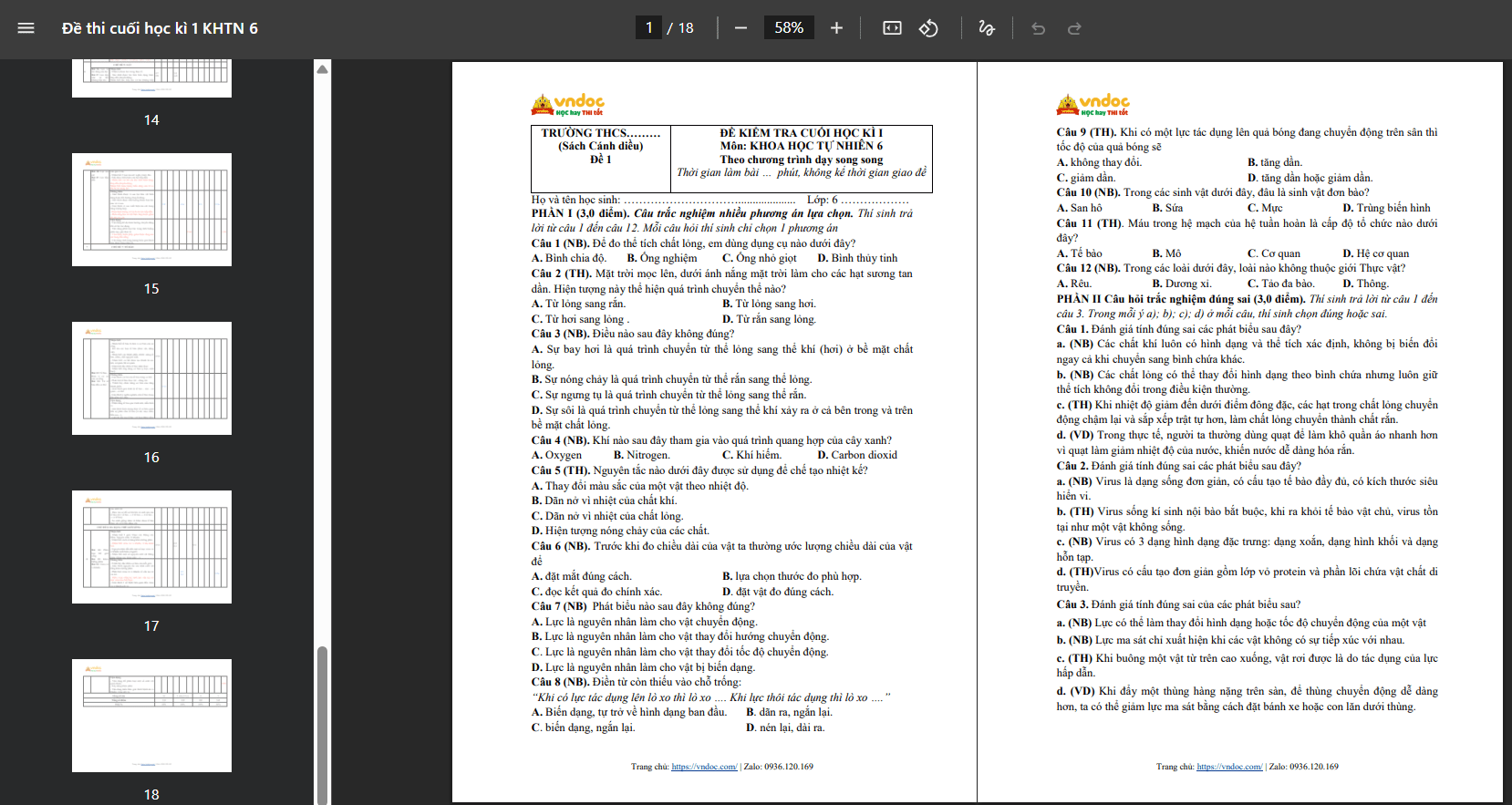 BẢN XEM THỬ ĐỀ KIỂM TRA HỌC KÌ 1 KHTN 6 SÁCH CÁNH DIỀU - DẠY SONG SONG