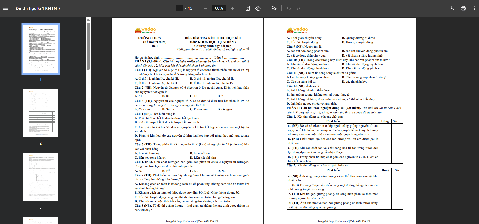 GIỚI THIỆU TÀI LIỆU: ĐỀ THI HỌC KÌ 1 KHOA HỌC TỰ NHIÊN 7