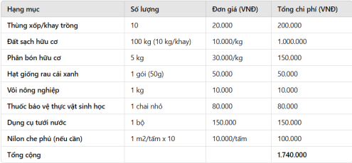 Câu 13: Khi lập kế hoạch trồng 10kg rau cải xanh trong thùng xốp, dự tính chi phí như sau: