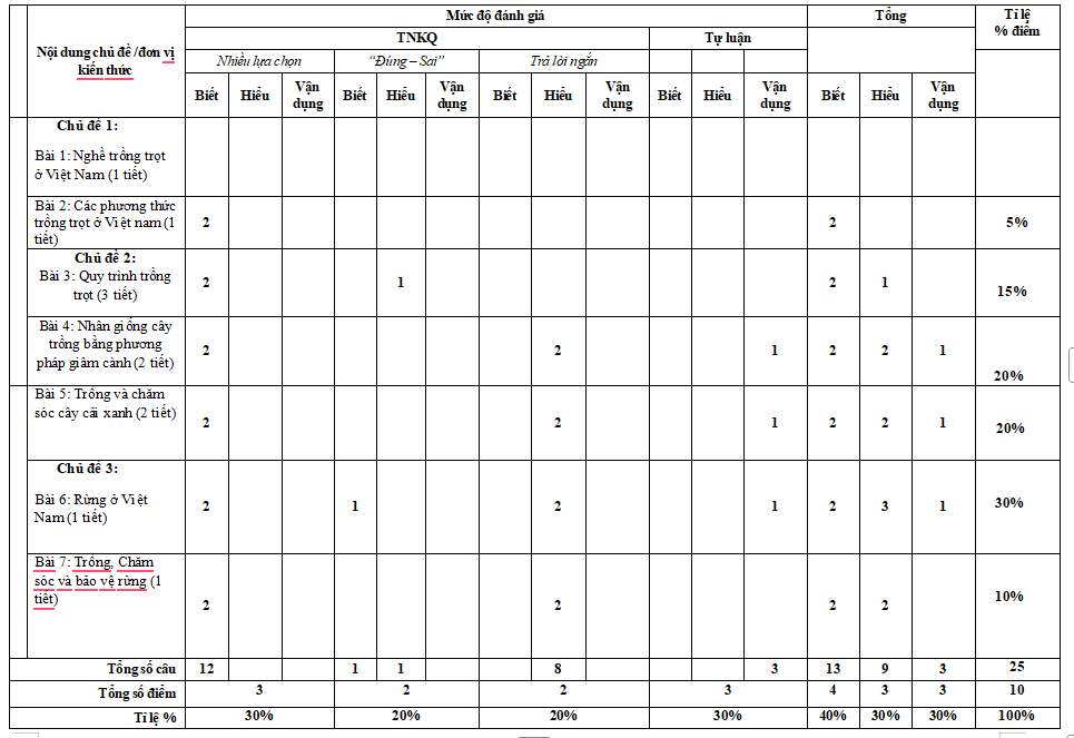 1. Khung ma trận và đặc tả đề kiểm tra giữa kì 1 môn công nghệ 7