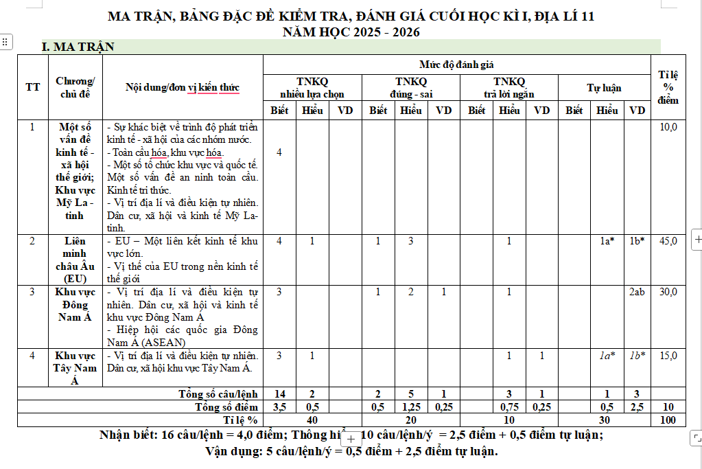 ĐỀ KIỂM TRA CUỐI KÌ I NĂM HỌC 2025 -2026 MÔN: ĐỊA LÍ 11 Thời gian làm bài: 45 phút (không kể thời gian phát đề) |