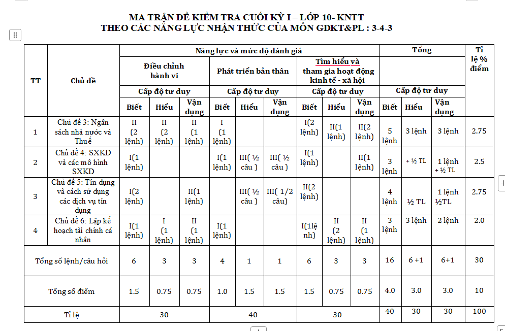 Lưu ý: Bộ đề thi cuối kì 1 Giáo dục Kinh tế và Pháp luật 10 Kết nối tri thức có cấu trúc như sau. Tùy theo yêu cầu của từng Sở mà thầy cô ra đề cho các em nhé. Thang điểm ở mỗi đề thi cũng khác nhau.