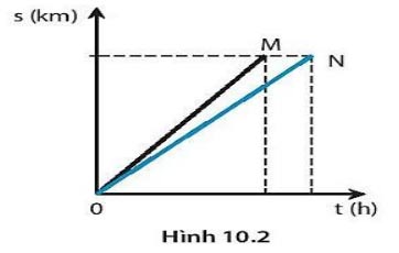 Câu 9: Minh và Nam đi xe đạp trên một đoạn đường thẳng. Trên Hình 10.2, đoạn thẳng OM là đồ thị quãng đường – thời gian của Minh, đoạn thẳng ON là đồ thị quãng đường - thời gian của Nam. Mô tả nào sau đây không đúng?