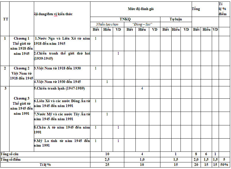 Lưu ý: Bộ đề thi cuối kì 1 Lịch sử 9 Kết nối tri thức có cấu trúc như sau. Tùy theo yêu cầu của từng Sở mà thầy cô ra đề cho các em nhé.