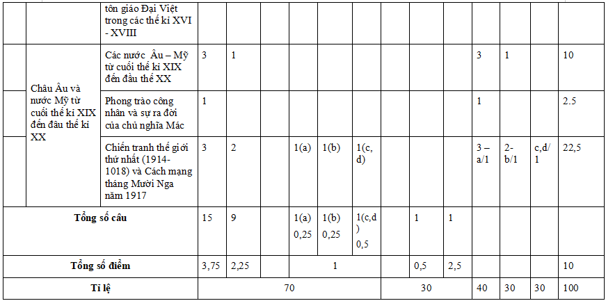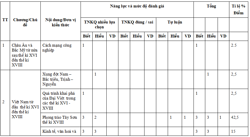 Ma trận đề thi cuối kì 1 Lịch sử 8