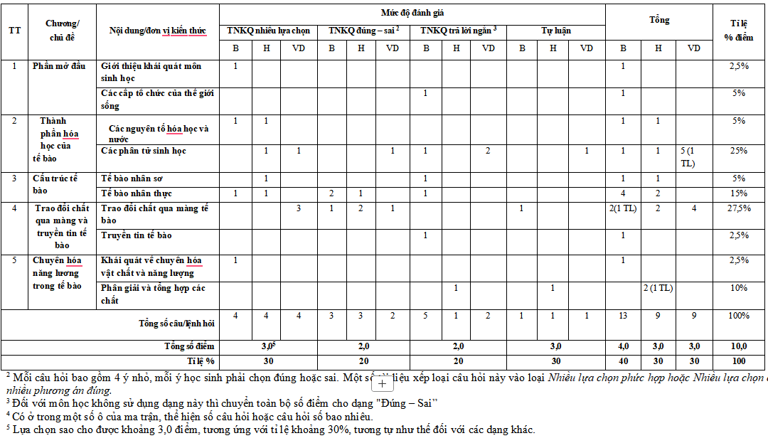Lưu ý: Bộ đề thi cuối kì 1 Sinh học 10 năm 2025 có cấu trúc như sau. Tùy theo yêu cầu của từng Sở mà thầy cô ra đề cho các em nhé.
