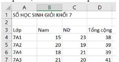 Câu 6: Hãy cho biết cách sao chép số học sinh Nam của lớp 7A vào số học sinh Nam của lớp 7B: