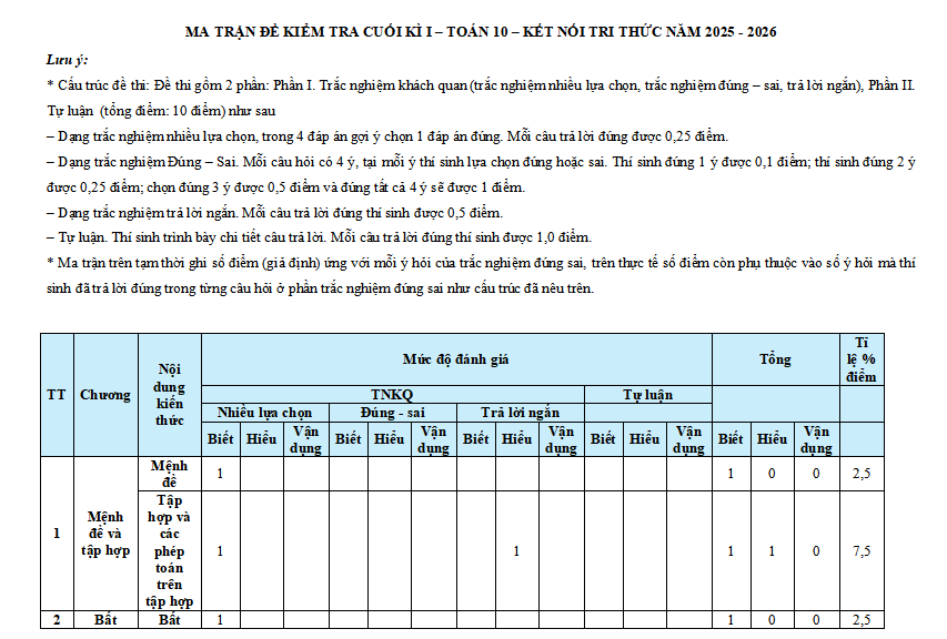 Bộ đề kiểm tra học kì 1 Toán 10 Kết nối tri thức năm 2025 có cấu trúc như sau. Tùy theo yêu cầu của từng Sở mà thầy cô ra đề cho các em nhé.