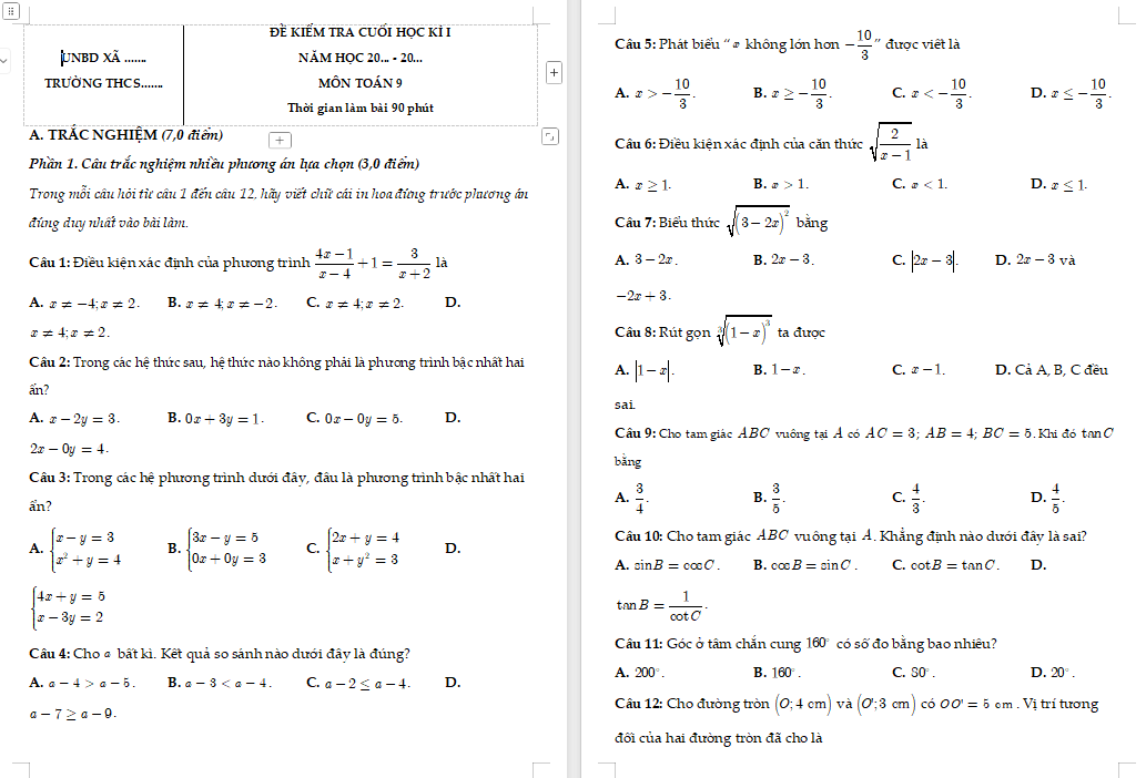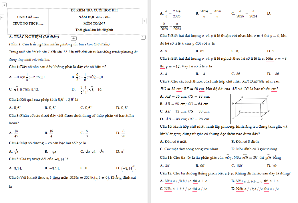 >> Đáp án đề kiểm tra học kì 1 Toán 7 có trong file tải về
