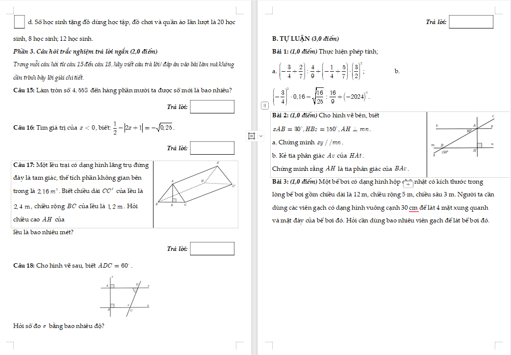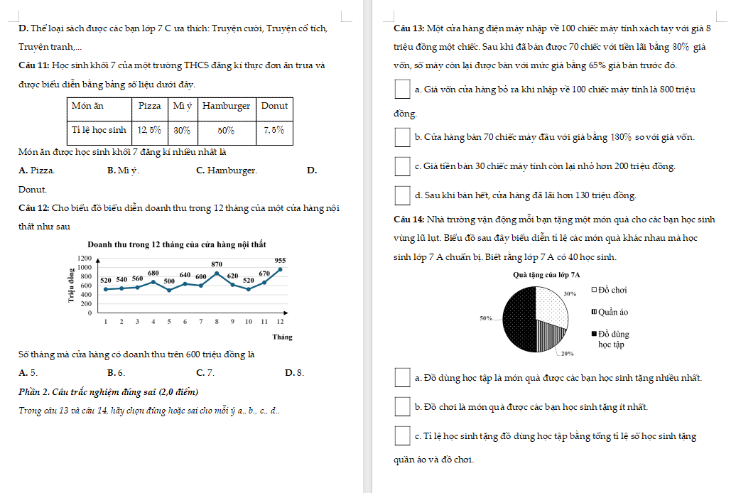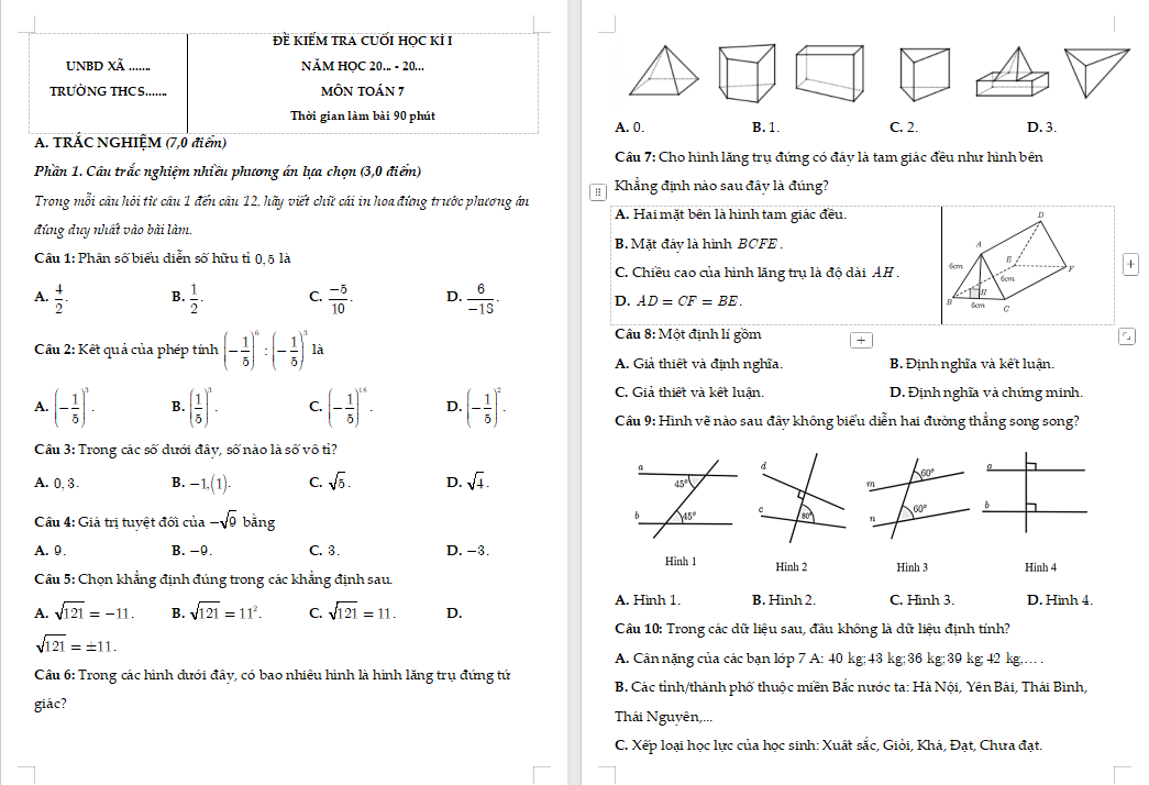 Lưu ý: Đề thi cuối kì 1 Toán 7 Chân trời sáng tạo có cấu trúc như sau. Tùy theo yêu cầu của từng Sở mà thầy cô ra đề cho các em nhé.