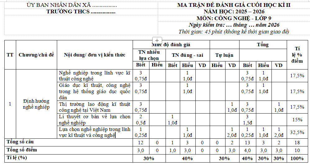 Lưu ý: Bộ đề thi cuối kì 2 Công nghệ 9 năm 2026 được biên soạn với cấu trúc dưới đây. Tùy theo yêu cầu của từng Sở mà thầy cô ra đề cho các em nhé.