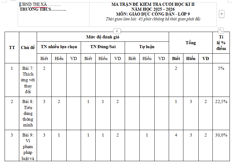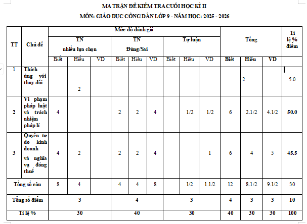 Lưu ý: Đề thi cuối kì 2 GDCD 9 năm 2025 - 2026 có cấu trúc như sau. Tùy theo yêu cầu của từng Sở mà thầy cô ra đề cho các em nhé.