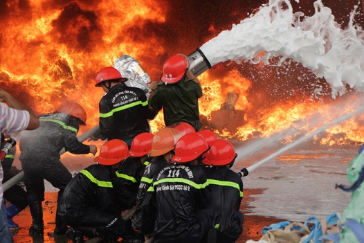 D. Bộ đồ bảo hộ phòng cháy chuyên dụng, xe cứu hỏa và hệ thống máy bơm phun chữa cháy.