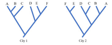 Dùng thông tin sau để trả lời câu 5 và câu 6: Trong hai cây phát sinh chủng loại trong hình dưới đây, các chữ cái (A - F) đại diện cho các loài.