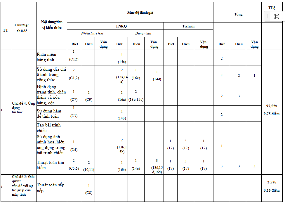 Đề thi học kì 2 Tin học 7 Chân trời sáng tạo được biên soạn gồm 1 đề theo Công văn 7991 với các dạng câu hỏi trắc nghiệm lựa chọn đáp án đúng, trắc nghiệm đúng sai và tự luận + 3 đề theo cấu trúc cũ. Đề kiểm tra học kì 2 Tin học 7 Chân trời sáng tạo sẽ giúp các em rèn luyện những kĩ năng cần thiết và bổ sung những kiến thức chưa nắm vững để đạt kết quả cao trong kì thi sắp tới. Bên cạnh đề thi môn Tin học 7 Chân trời sáng tạo các bạn xem thêm: đề thi học kì 2 môn Toán 7 Chân trời sáng tạo, đề thi học kì 2 môn Ngữ văn 7 Chân trời sáng tạo, đề thi học kì 2 môn Giáo dục công dân 7 Chân trời sáng tạo.