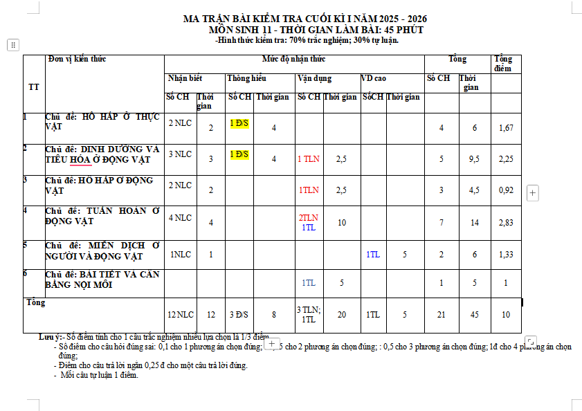 ĐỀ KIỂM TRA CUỐI KỲ 1 NĂM HỌC 2025 - 2026 Môn: Sinh học 11 Lớp: 11 Thời gian : 45 phút (không kể thời gian phát đề) |