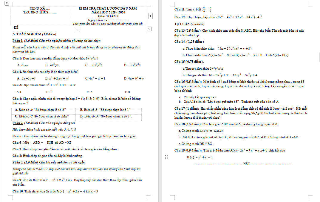 Đề thi khảo sát chất lượng đầu năm môn Toán lớp 8 năm 2025 - 2026 Đề khảo sát chất lượng đầu năm lớp 8 (Cấu trúc mới, có đáp án)