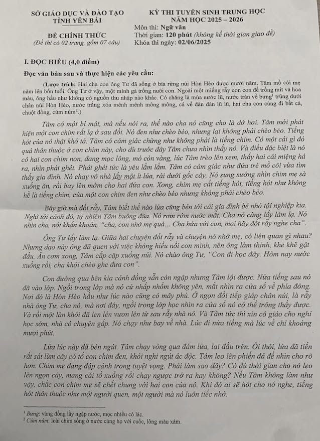 Kỳ thi tuyển sinh vào lớp 10 tại Yên Bái sẽ diễn ra trong hai ngày 2/6 - 3/6. Cấu trúc đề thi vào lớp 10 môn Văn Yên Bái gồm 120 phút với cấu trúc 4 điểm đọc hiểu + 6 điểm tập làm văn. Với đáp án đề thi vào 10 môn Ngữ văn Yên Bái sẽ giúp các em thuận tiện so sánh đáp án với bài làm của mình. Từ đó dễ dàng nắm được số điểm mình đạt được. Bên cạnh đó các bạn có thể tham khảo thêm đáp án đề thi môn Toán, Tiếng Anh.