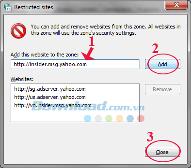 Bước 4: Tiếp theo hộp thoại Restricted sites xuất hiện, bạn nhập lần lượt các trang web này vào ô Add this website to the zone: