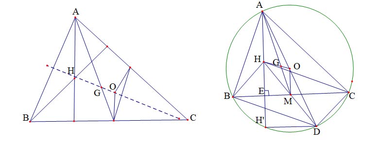 Cách 2: Kẻ đường kính AD của đường tròn (O) ta có B H \wedge A C\(B H \wedge A C\) (Tính chất trực tâm) \mathrm{AC}^{\wedge} \mathrm{CD}\(\mathrm{AC}^{\wedge} \mathrm{CD}\)(Góc nội tiếp chắn nửa đường tròn) suy ra BH / / CD. Tương tự ta cũng có CH / / BD nên tứ giác BHCD là hình bình hành, do đó HD cắt BC tại trung điểm của mỗi đường. Từ đó cũng suy ra O M / /=\frac{1}{2} A H\(O M / /=\frac{1}{2} A H\) (Tính chất đường trung bình tam giác ADH ). Nối AM cắt HO tai G thì \frac{G O}{G H}=\frac{O M}{A H}=\frac{1}{2}\(\frac{G O}{G H}=\frac{O M}{A H}=\frac{1}{2}\) nên G là trọng tâm của tam giác ABC .