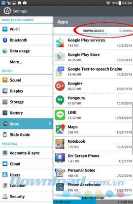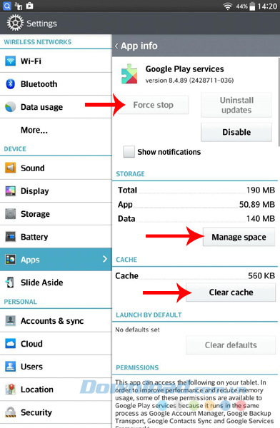 Bước 3: Tại đây, chúng ta kéo xuống dưới và tìm các mục Google Play services, chọn vào Clear Cache, Force stop.