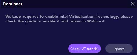 VT - Virtualization technology là công nghệ cung cấp khả năng chạy nhiều hệ điều hành riêng biệt trên một phần cứng máy chủ, nhờ đó, trình giả lập có thể tận dụng nhiều tài nguyên hơn. Bạn nên kích hoạt VT bởi nó có thể cải thiện hiệu suất của máy tính, đồng thời, cho phép Wakuoo chạy mượt mà & nhanh hơn.