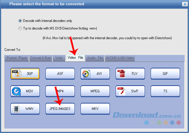 Bước 3: Trong hộp thoại Please select the format to be converted, click chuột trái vào thẻ Video File và chọn JPEG IMAGES.