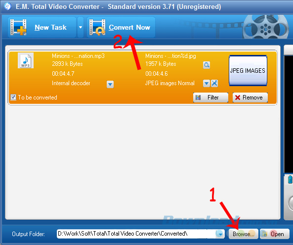 Bước 4: Sau khi đã xác định được video cần xử lý, bạn có thể thay đổi đường dẫn sẽ lưu lại file sau khi convert bằng cách nhấp vào Browse ở Output Folder bên dưới rồi chọn tiếp vào Convert Now để thực hiện.