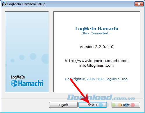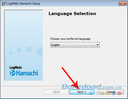 Bước 1: Sau khi tải về bộ cài Hamachi, các bạn click vào file để bắt đầu. Chọn Next ở giao diện đầu tiên (sau khi chọn ngôn ngữ muốn hiển thị cho Hamachi).