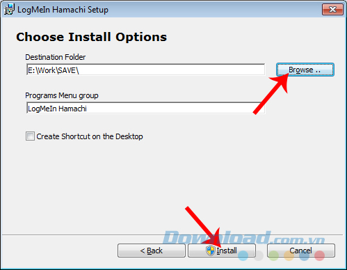 Bước 3: Nhấp vào Browse để tìm vị trí cài đặt cho Hamachi, sau đó Install.