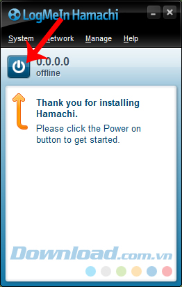 Đây là giao diện chính của Hamachi sau khi cài đặt. Để bắt đầu sử dụng Hamachi, nhấp vào biểu tượng Power.