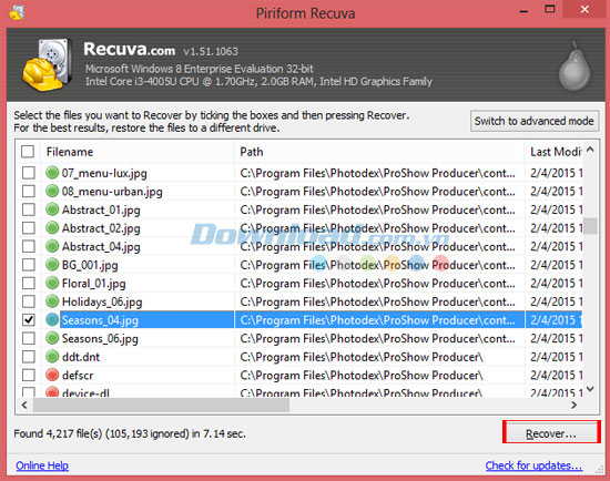 Sau đó, lựa chọn file mà bạn muốn phục hồi bằng cách nhấn chuột vào các hộp và sau đó chọn Recover.