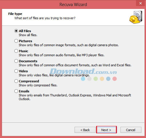 Tiếp theo, lựa chọn loại file mà mình muốn phục hồi. Ở đây, có sẵn các tùy chọn như: tất cả file, ảnh, nhạc, tài liệu, video, file được nén, email. Khi đã chọn xong, nhấn Next để tiếp tục.
