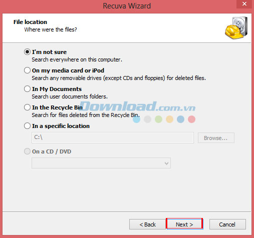 Bước tiếp theo, vui lòng lựa chọn vị trí mà bạn đã làm mất tập tin của mình, chẳng hạn: trên thẻ media hoặc iPod, trong mục My Documents, Recycle Bin, hoặc tìm kiếm mọi nơi trên máy tính, vv và nhấn Next để chuyển sang cửa sổ tiếp theo.