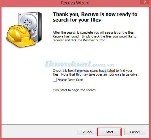 Sau khi quá trình tìm kiếm hoàn tất, bạn sẽ nhìn thấy một danh sách chứa các tập tin được Recuva phát hiện. Đơn giản, chỉ cần nhấp chuột vào file mình cần phục hồi và nhấn nút Recover. Bên cạnh đó, có thể chọn chế độ Deep Scan nếu các bản quét trước đó không thể tìm thấy tập tin mong muốn. Lưu ý: điều này sẽ mất bạn khá nhiều thời gian. Tiếp đó, nhấn Start để bắt đầu tìm kiếm.