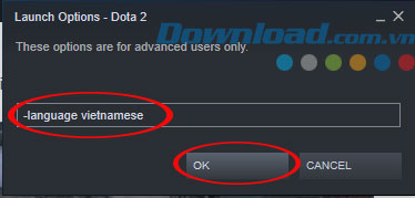 Tại cửa sổ Launch option hãy chọn đến ngôn ngữ là tiếng Việt bằng cách nhập -language vietnamese và nhấn OK để ghi nhận thay đổi.